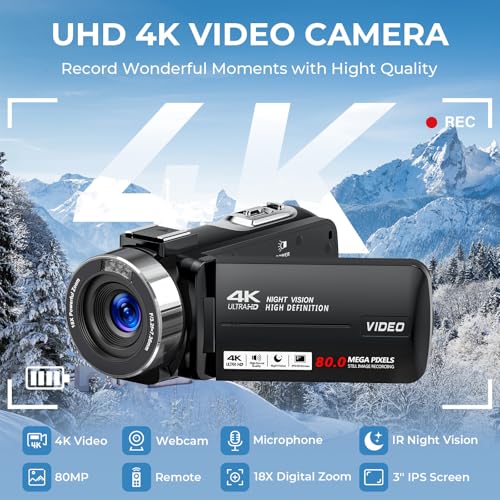 Specification: Camcorder Video Camera 4K HD 80MP Vlogging Camera for YouTube IR Night Vision Camera 18X Digital Zoom 3.0 IPS Screen Video Recorder with 32GB SD Card, 2 Batteries, Remote Control