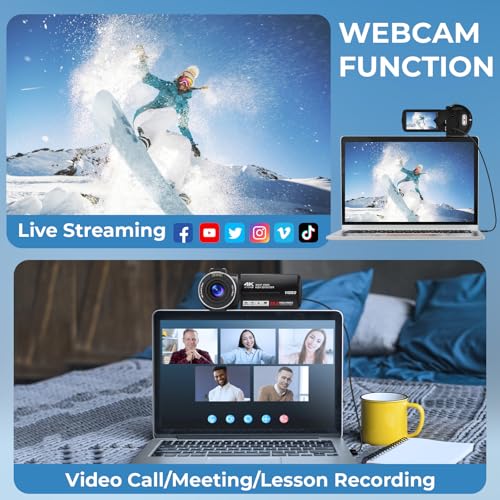 【Webcam Function & Pause Function】This 4K digital video camera can be used as a webcam for YouTube, TikTok, and Facebook when connected to your computer via USB. You can use it to make video calls or stream live videos with your family and friends. The digital zoom function is still supported in Webcam Mode. This camcorder has many powerful features, including the pause function, HD selfie, slow motion, timed photo, and more.