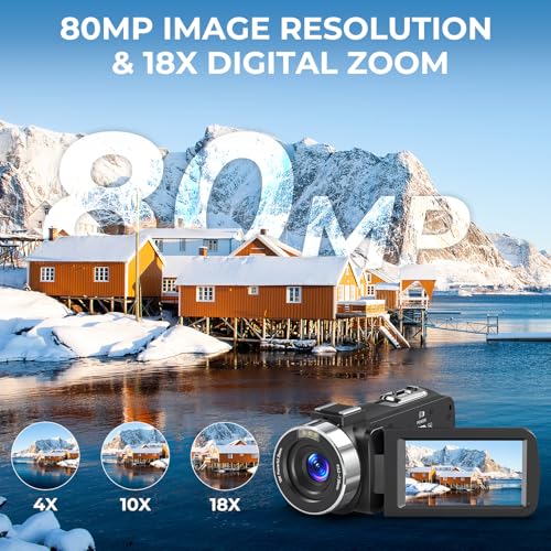 【Ultra HD 4K 80MP video camera】This 4K video camera offers an HD resolution of 4K (30 FPS) and an 80MP high pixel lens.Whether you’re filming a happy family reunion or your children’s childhood moments with this HD camcorder, you can capture everything precisely.Thanks to the 18X digital zoom, you can zoom in on distant subjects effortlessly. This video camera is ideal for videography beginners. Its compact design and weight of less than 500g make it easy to handle.