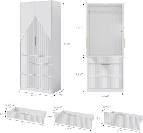 71.7″ Wardrobe Armoire Wooden Closet with 2 Doors and 3 Drawers, Bedroom Armoire with Hanging Rod Shelf, Large Capacity Storage Wardrobe Armoire, Freestanding Wooden Closet Storage Cabinet White