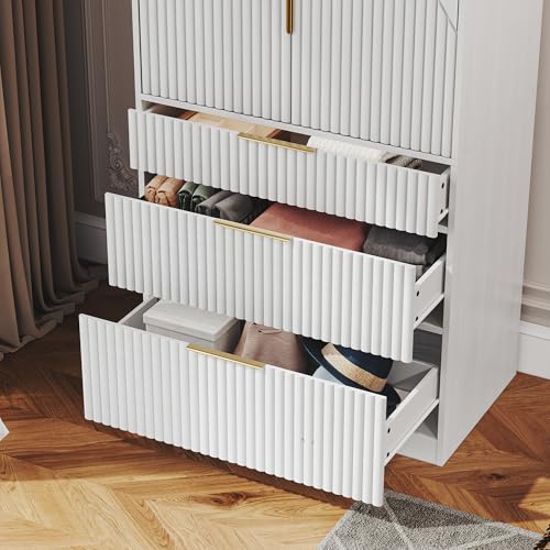 【Modern Armoire Wardrobe Closet】 White wood grain finish of the Wardrobe and delicate edge banding give it a modern and elegant look. This wooden wardrobe is simple, it combines wave panels with gold handles to create luxury charm.This large wardrobe matches well with various house decors. The clean lines and elegant finishes create a sophisticated look, adding a touch of class to your living space. This wooden wardrobe will be a prefect addition to your home. Perfectly with many different house decors.