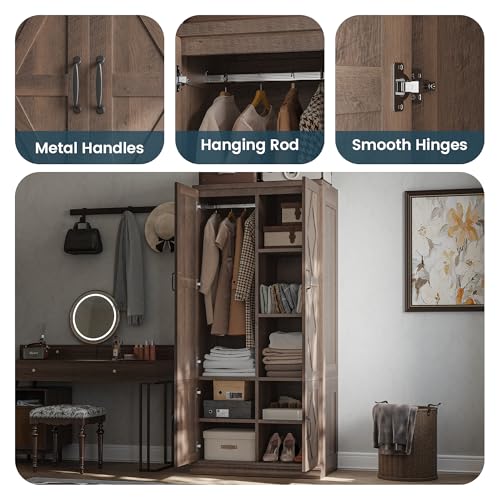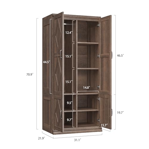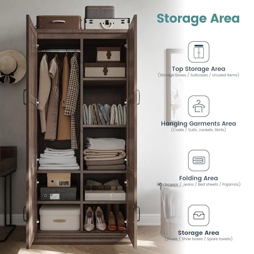 ANCTOR Wardrobe Closet, 71″ H Tall Wooden Closet with 5 Clothing Shelves, 4 Doors and Hanging Rod for Hanging Clothes, Bedroom Freestanding Armoire Storage Cabinet, Stand Alone Clothing Unit, Brown