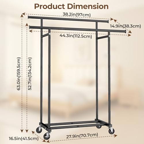 【𝙇𝙖𝙧𝙜𝙚 𝙇𝙤𝙖𝙙𝙞𝙣𝙜 𝘾𝙖𝙥𝙖𝙘𝙞𝙩𝙮】The rolling clothing rack is made of heavy duty and 22mm diameter steel, and the stable structure design allows this garment rack to hold up to 210 lbs without deformation (160 lbs for the double rods and 50 lbs for the bottom shelf)