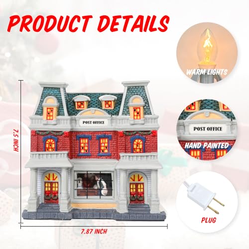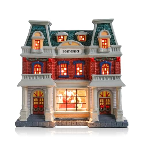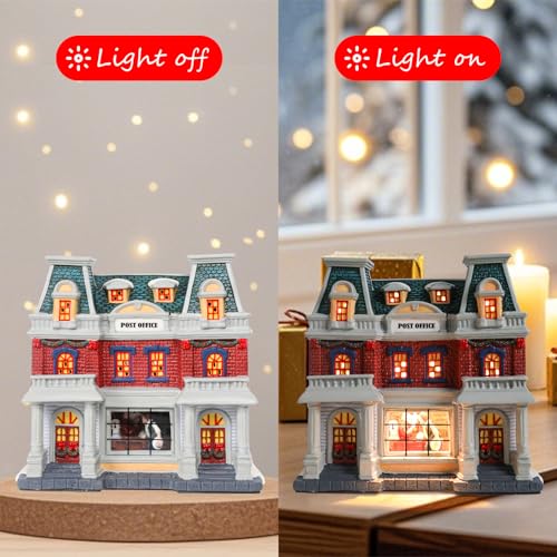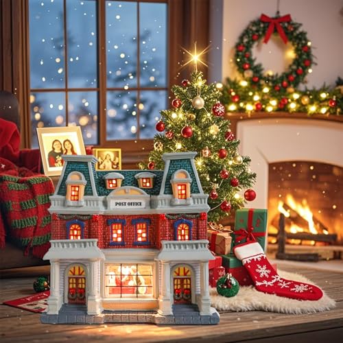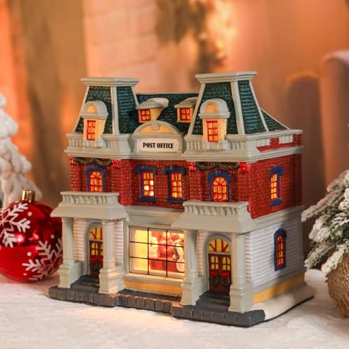 DREAM GARDEN Christmas Village House, Ceramic Post Office with LED Light Christmas Collectible Buildings for Tabletop Decoration Xmas Mantle Home Decor