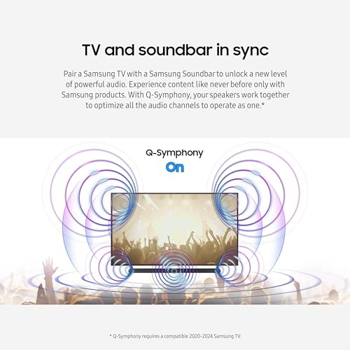 Q-SYMPHONY: Pair a Samsung TV with a Samsung Soundbar for a new level of powerful audio; Experience content like never before only with Samsung products; With Q-Symphony, your speakers work together to optimize all audio channels to operate as one¹